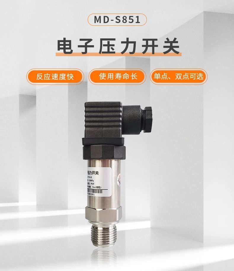 MD-S851电子式压力开关,内置高精度压力传感器,采用晶体管输出,NPN/PNP输出可选,输出无延时、无抖动等持点,使用寿命长。