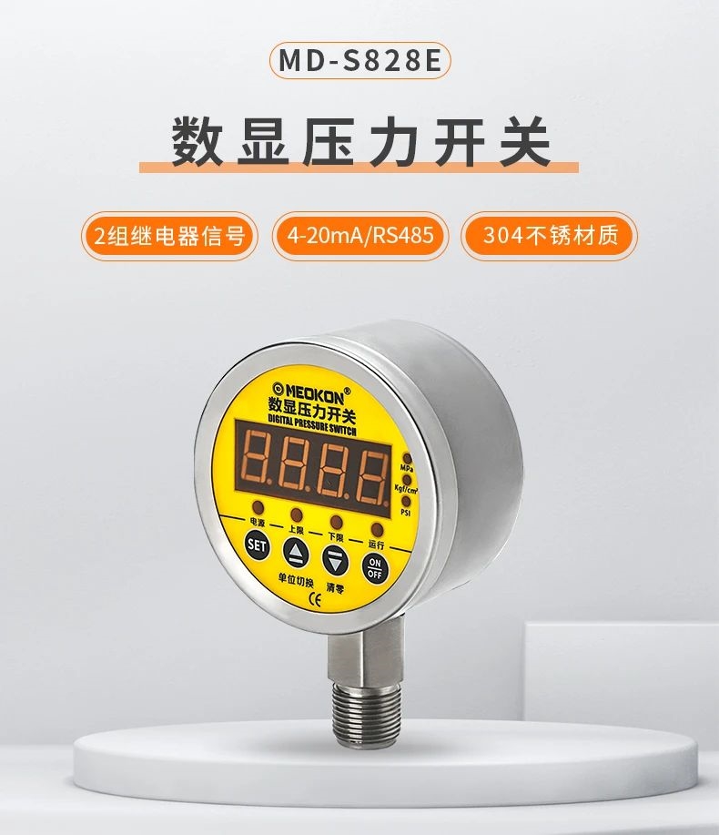 MD-S828E智能型数显压力开关,集压力测量、显示、控制于一体的数字式压力开关,可设置两路常开常闭报警点,也可实现两路高低压控制,另外具有一键清零,三种显示单位切换等多种功能。