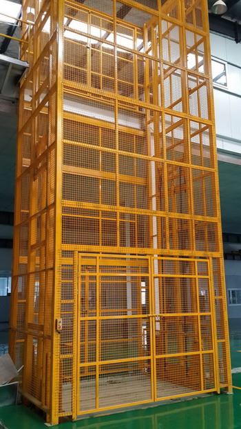 液压货梯克服了普通电梯式货梯称重力的不足,可称重几十吨到近百吨的货物。简单方便,安装较普通货梯也方便。(具体承载力及升高层数、尺寸可根据用户要求设计制作)液压电梯:是依靠液压驱动的电梯,液压电梯是通过液压动力源,把油压入油缸使柱塞作直线运动,直接或通过钢丝绳或者链条间接地使轿厢运动的电梯。台面设有防滑绝缘扣板,保证货物及人员的安全
