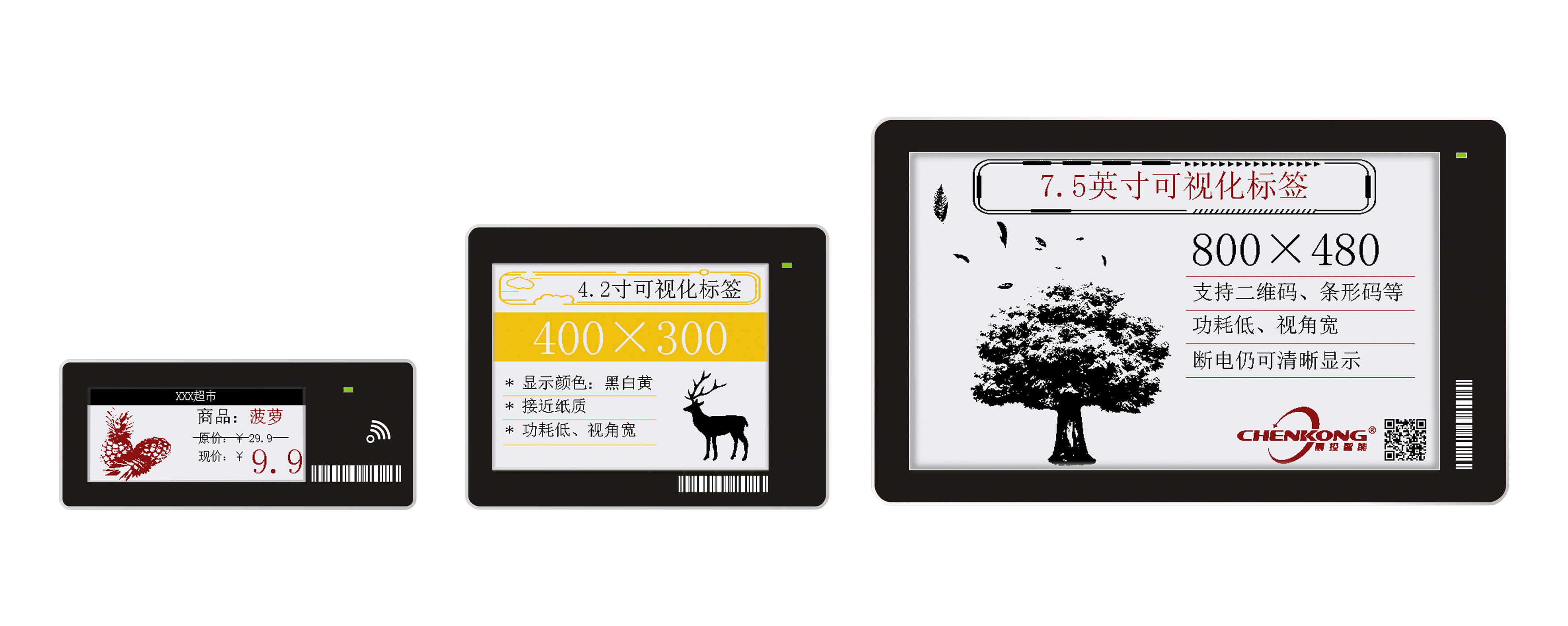 晨控采用UHF+电子纸显示屏的功能架构,在无操作状态下功耗基本为零,通过超高频、NFC、蓝牙进行数据传输,功耗极低。晨控智能墨水屏标签有三种尺寸可选,分别是2.9寸、4.2寸和7.5寸,满足客户各种显示需求。VT标签可以通过上位机组态软件,通过拖拉图标的方式,便能灵活更改显示内容和布局,极大的方便了客户个性化的需求。