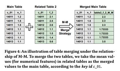 下图描述了多表融合最复杂情况多对多(M-M)情况的处理:表A中的一行可能与表B中的许多行链接在一起,反之亦然。深兰团队根据特征类型(即分类或多分类特征,数字特征或时间特征)合并相关表。例如,对于数字特征和分类特征,团队将相关表中的平均值和众数作为主表中key ids的值。至于时间特征,则将最新时间作为主表的合并值。