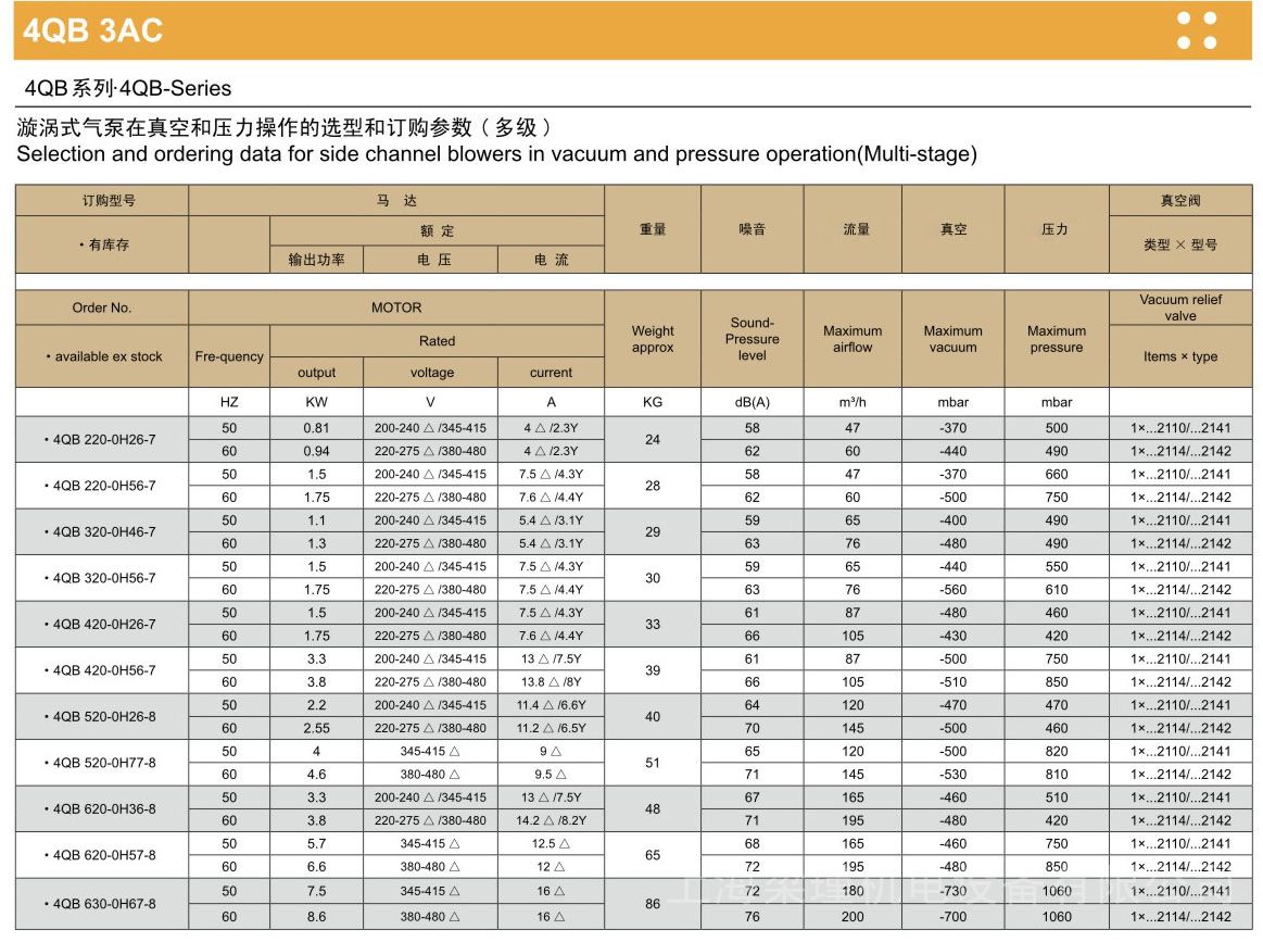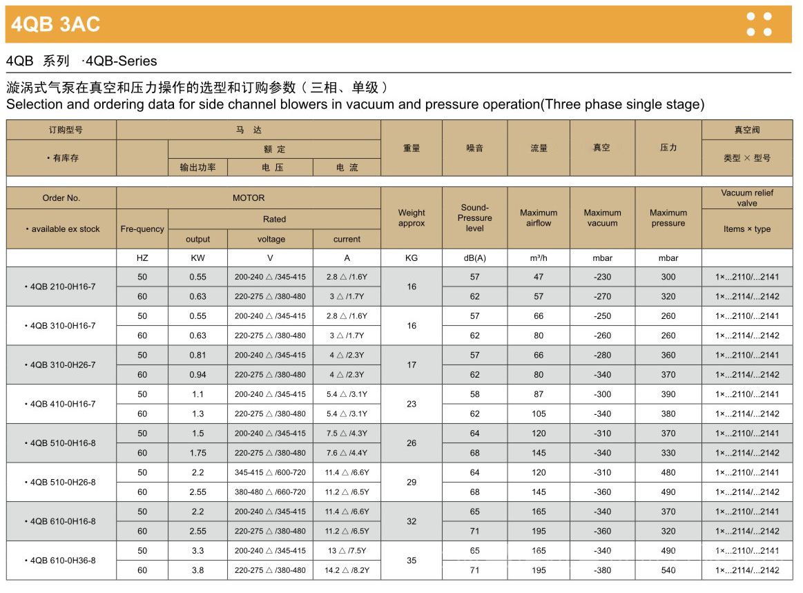 3.相对于离心风机和中压风机来说,其压力高很多,往往是离心风机的十几倍以上,比如说有一款型号为4QB 630-0H67-8的梁瑾气环真空泵,其输出压力高达100KPA;