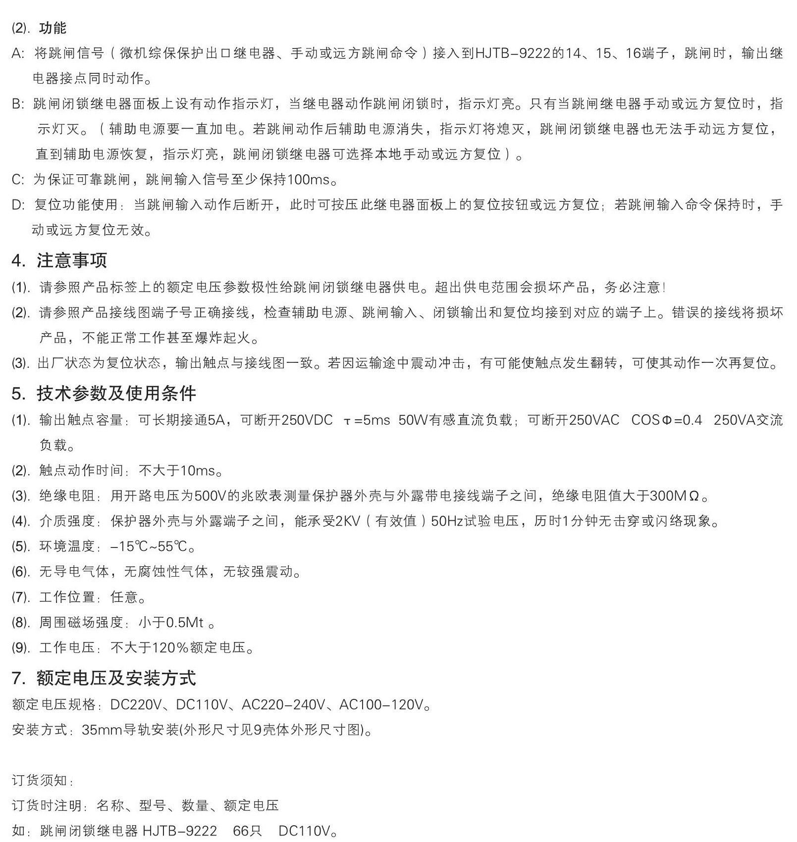 (1).请参照产品标签上的额定电压参数极性给跳闸闭锁继电器供电。超出供电范围会损坏产