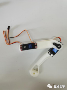 将图13中的打印件与之前组装好的小腿组装在一起。首先将大腿打印件连接到组装好的小腿部件上,确保舵机旋转的最大角度与大腿和小腿之间的最大弯曲相匹配,确保舵机的运动范围合理,同时需要注意舵机线需要穿过打印件内部的导线通道,避免外露。完成后如图14所示。