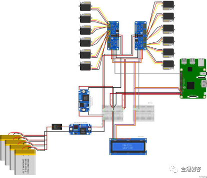 对于机械狗电路的搭建主要参照图24,首先电源处接入一个船型开关,便于开断电源,然后接入稳压模块给树莓派供电,另外无需降压直接给舵机驱动板供电,然后舵机驱动板连接机械狗的12个舵机。除此之外,树莓派的IIC接到舵机驱动板和液晶屏上(如果有的话)。