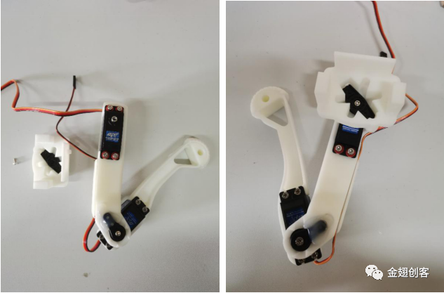 安装完肩部舵机臂后,需要将其安装到之前安装好的大腿上,固定之前注意调整舵机的旋转角度。