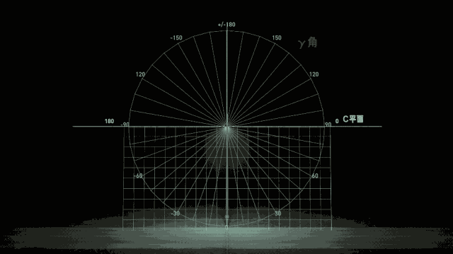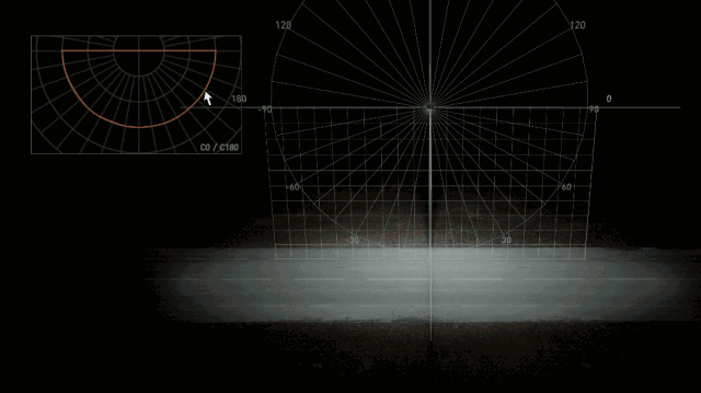 路灯的光强分布通常用 c-γ 坐标系表示,路灯是坐标系的中心点,把路灯向路面做垂线,把垂线平移就可以拉出一个 c 平面,让 c 平面围绕垂线旋转,就得到了各个角度上的 c 平面,其中 c=0° 和 c=180° 度与道路方向平行。