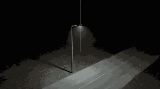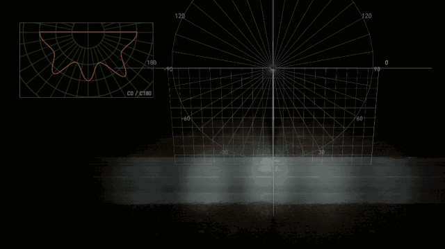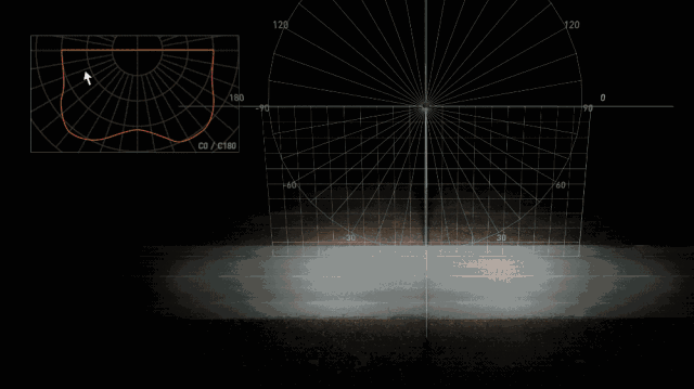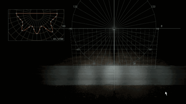 这是我们根据左上角的配光曲线渲染出来的路灯模型,这个绿色光圈上的每一个点的光强都对应着配光曲线上对应 y 角的光强值。