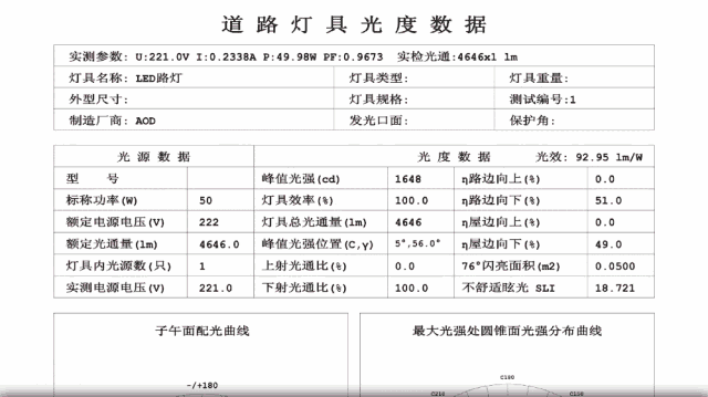 这个一份半截光型路灯的测试报告,总光通量 4646 流明,平均光强 1321 cd ,相当于 1300 支蜡烛。