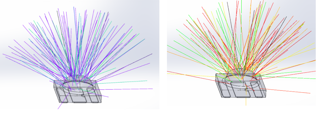 对于光源颜色比较严格的情况下,采用含有光谱信息的Ray File,在仿真设计阶段进行相应的补偿设计,可以极大的消除光源颜色不均匀现象。而光源的光谱Ray file 采用分别测试蓝光、黄光Ray file,结合各自波段的特征光谱信息,可以取得高解析度的光谱Ray File文件。而且,测试速度、效率完全满足产业需求。
