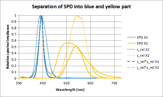 2、根据平均光谱与光度探头的光谱匹配信息、X1(蓝光)、X2(黄光)波段光谱响应特性,计算光通补偿系数和蓝光、黄光光通比