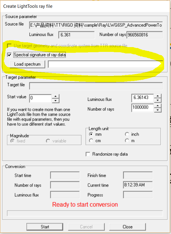 我们可以将蓝光和黄光分别进行近场测试,得到两个Ray File 文件,然后将归一化的蓝光和黄光光谱信息分别融合进蓝光和黄光Ray File,在仿真时,将这两个光谱Ray file导入仿真软件,就可以获得这个光源全光谱的ray file。