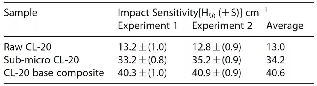 表1 未加工CL-20,亚微结构CL-20和基于CL-20复合材料的撞击敏感度