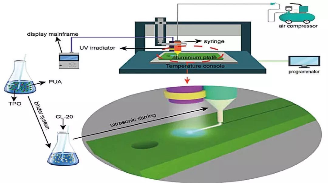 在这种场景下,传统的炸药装填技术已经不能满足安全性、性能及生产效率的要求,因此墨水直写技术(DIW)就应运而生。墨水直写技术已经成为美国陆军当前MEMS中炸药填充的主要方式。这种炸药墨水是一个多组分体系,通常包含炸药、连接料和其他添加剂。炸药墨水通常有两种方式:全液体型和悬浮型。全液体型是将炸药、连接料和添加剂溶解在有机溶剂中。但是CL-20的晶型不易控制,在应用中容易导致安全问题,而且墨水书写和干燥的时间也很长。悬浮型炸药墨水是通过热引发聚合来进行固化的,它很难在短时间内固化完全。另外,这种悬浮体系在制作准备的过程中存在较严重的物料浪费情况。其他的一些体系对于MEMS设备也不是特别实用。在这种情况下,UV光固化技术作为一种快速固化、绿色节能,而且固化后材料具有优良性能的技术,在能量材料制备方面就充当了重要的角色。来自中北大学的安崇伟教授等人成功采用了UV光固化技术来制备了基于CL-20的高性能引爆体系。