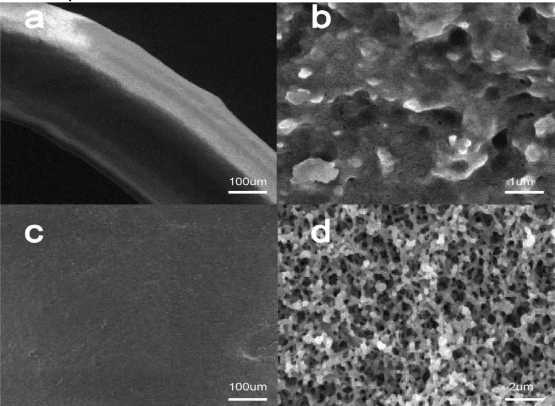 图3 基于CL-20的UV光固化炸药材料固化后的电子扫描电镜图。表面(a,b),和横截面(c,d)