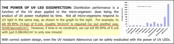目前在专业文献上可以查到不同微生物的UV灭活剂量表,这个剂量是针对254nm波长的传统UVC灯管而言的,由于微生物对于不同波长UVC光的敏感性不同,传统的剂量表不适用于265-280nm波长的UVC-LED。