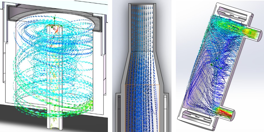 然而光凭一个内部结构和肉眼观察,我们一无所知。这时候一个定性的模拟仿真就能帮到我们。例如下面三张图没有任何的数据,我们依然能直观的看出设计的优劣:左图利用规则的旋流增加水体的照射时间,中图利用低雷诺数结构避免出现短流,右图杂乱无章的流线表明其流体设计不佳,还有很大的改进空间。