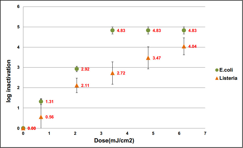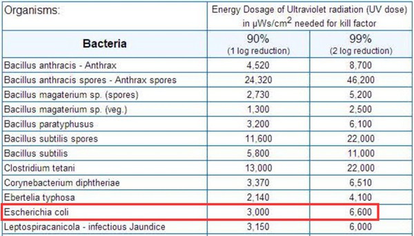 下面以大肠杆菌(E.coli)为例,使用UVC灯管达到99%的灭杀率需要的UV剂量为6.6mJ/cm2,使用UVC-LED要高效一些,达到99.99%的灭杀率两家同行给出的UV剂量分别约为3mJ/cm2与5mJ/cm2。
