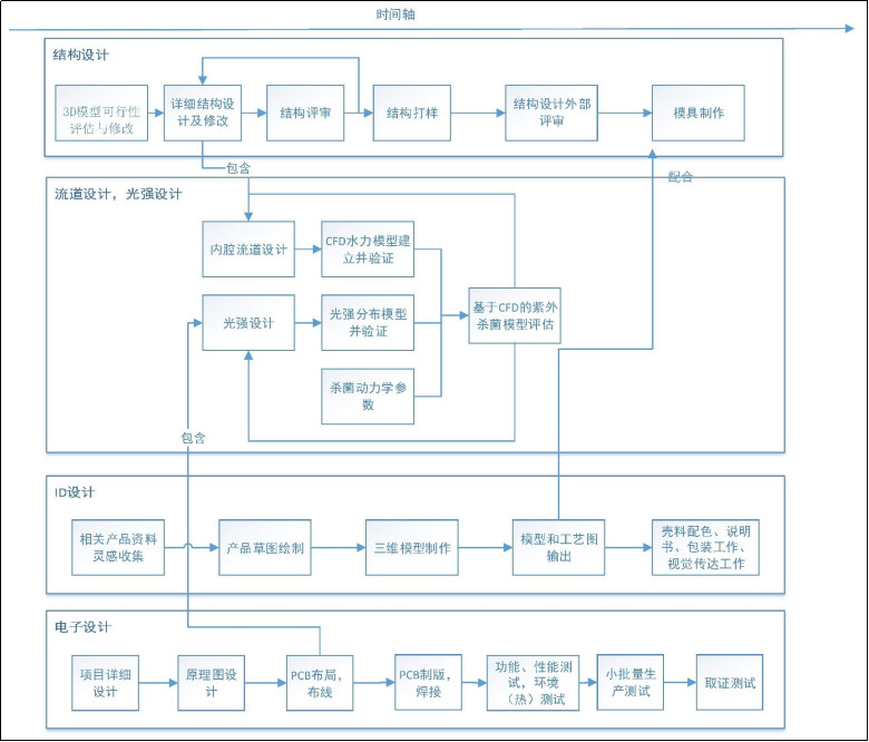 下图是UVC-LED应用产品研发流程的一部分,仿真设计贯穿于产品设计过程中,与结构、ID、电子设计是紧密联系的并行关系。