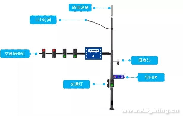 智慧灯杆A:高12米,可搭载照明、通信设备、交通信号灯、路牌、导向牌及监控等设施.接口预留,其他设施可根据需要搭载。