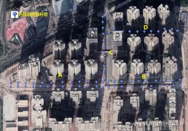规划试点区域为某新城,定义为商业中心、高端居住中心、生态中心,打造国际中央居住区。ABCD为一期“智慧灯杆”试点路段,位于住宅小区中央的市政道路,为双车道道路,路宽约30米,试点路段全长约1100米。