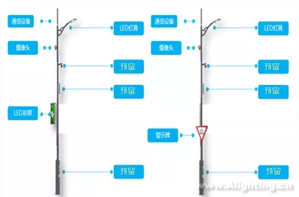 智慧灯杆B、C:高9-11米,可搭载照明、通信设备、LED屏幕、监控等设施,接口预留,其他设施可根据需要搭载。