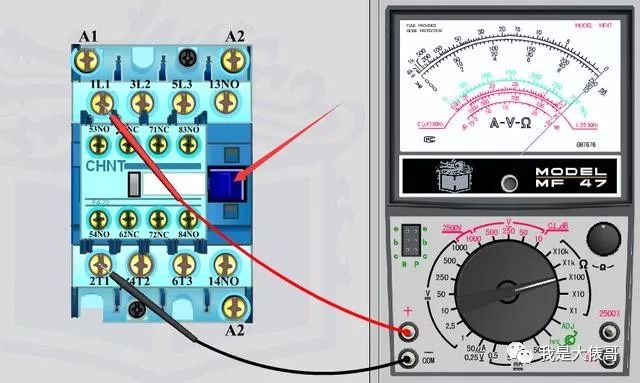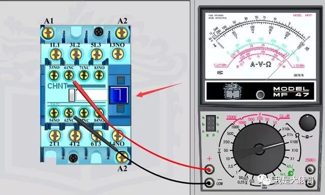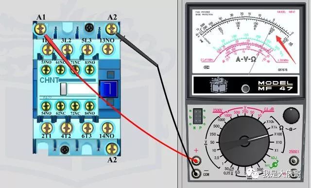 常见的接触器都是一个A1点2个A2点,2个A2内部是连一起的。所以我们只需要红黑表笔各接触一点,只要万用表显示有阻值线圈就是好的。如果指针没用动,说明线圈坏掉了,如果指针指到0也是坏的。