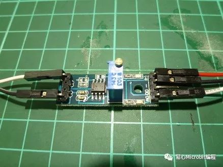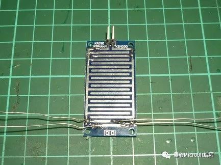 7b.但如果只是用原本的感测板,其感测范围看起来偏小。如图7b所示,你可以看到感测板上有许多条线,但实际上只是两条线互相交错而已,所以可以在两条在线焊接几条电线,而这些电线可以用来侦测水滴。因为打算将这块感测板放在战车上,所以不需要用电工胶带包覆。