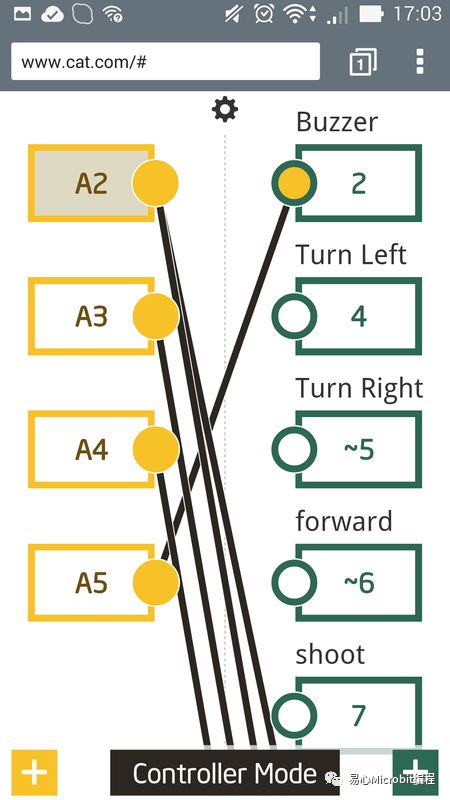 8e.按下在选择脚位画面下方的ControllerMode便可进入控制模式(图8e),在控制模式中,你可以将图中「forward」的箭头拉到最右边,再进入A2的控制模式中,将左方的横杆位置移到正中间,当你这样做之后,马达控制板上连接马达正负极的LED应该会亮起,转动马达使机器人顺利往前进。