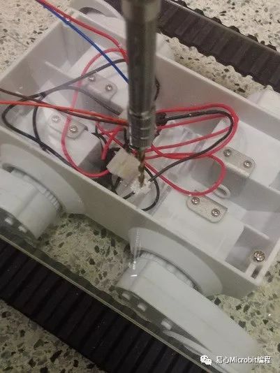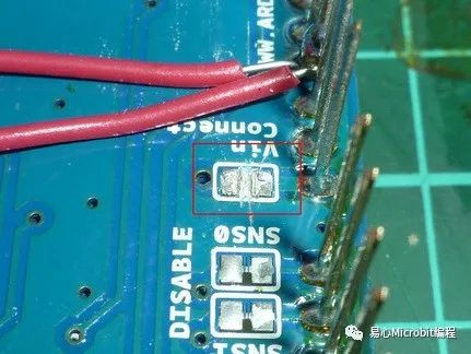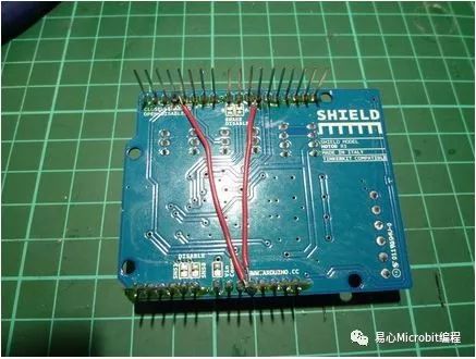 4a.依据图4a所示,将马达扩充板背面用来控制马达A和马达B的PWM脚位与5V脚位相连,你可以选择使用杜邦接线跨接,但为了避免线路过于复杂,所以我选择在背面加工。