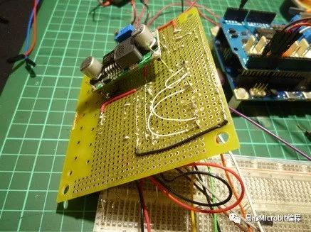 在焊接时请依照电路图中的方式来进行,与前面所提到的马达一样,这部分所用的电压同样为5V,所以请用排针将降压模块焊到万用电路板上。为了要让光耦合电路得以顺利运行,光敏电阻和LED两者必须靠得非常近。焊接完成之后,必须把每组LED与光敏电阻用电工胶带包覆起来,以防外部光线影响光敏电阻的效果。