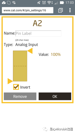 8d.接着可以针对模拟与数字脚位进行编辑,首先点选A2的字,跳出设定选单将「Invert」选项勾起来,之后点选「OK」便可离开选单。因为ConeectAnyThing可以实时监控各个脚位,所以此时你可以看到A2的背景变成全灰,但如果开发板上并没有接任何线路的话,背景并不会产生任何改变。