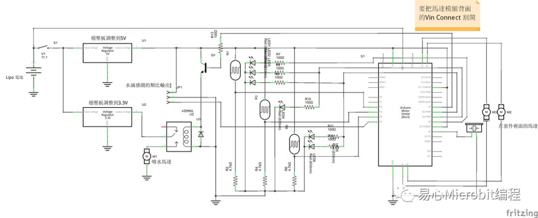 6a.为了提高配线时的便利性,这里选择使用5V的继电器来控制喷水马达的运转,这样便可以直接将电源输入端与光感测电路共享(图6a)。