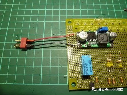 3b.我先用排针将11.1V转5V的降压模块固定在万用电路板上,再把连接电池用的公T型接头焊到降压模块的输入端(图3b)。