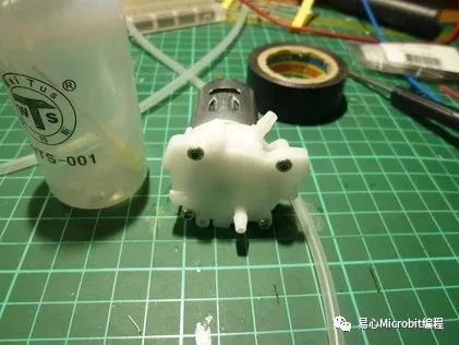 6c.接着来制作储水用水箱,这里选择的是一般的尖头塑料瓶,直接把购买喷水马达时附赠的水管接到塑料瓶的管口上,再用胶带把相连的地方黏起来以防漏水。