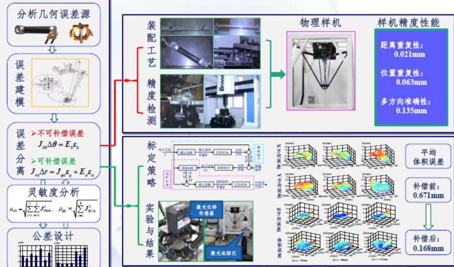 针对可补偿误差,我们需建立运动学标定模型,在后面控制系统里进行补偿;针对不可补偿误差,我们需进行灵敏度分析和公差设计,确定关键零部件的制造和装配精度,并依据该精度确定零部件的装配工艺和检测方法。