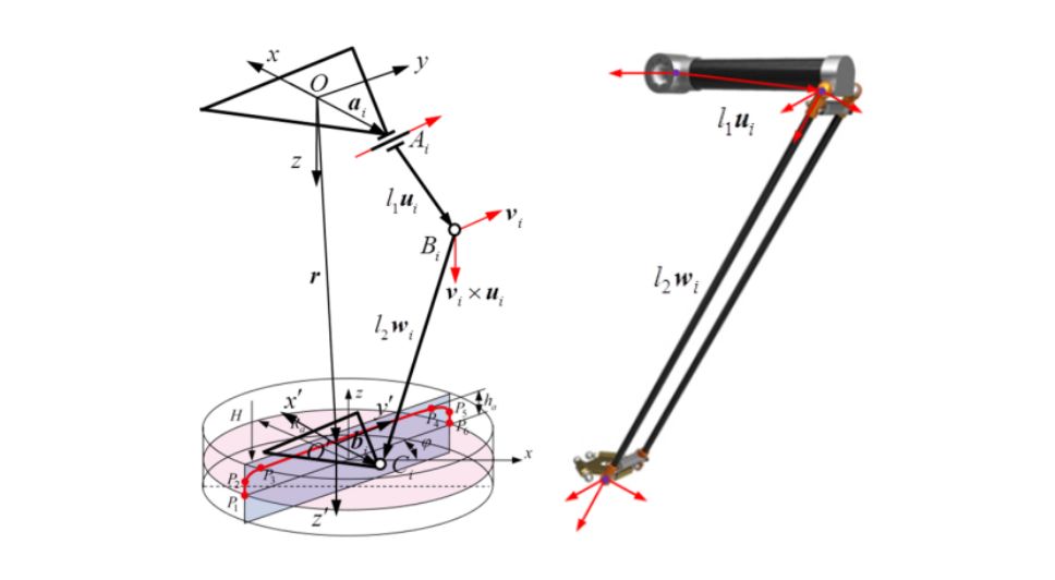从技术上来说,第一步,我们先得用空间向量或者螺旋理论建立描述我们这个机构输入输出关系的运动学、动力学模型;第二步,我们需要结合机构的运动特性提炼运动学和动力学方程中的优化目标和约束条件,对机构的尺度参数和结构参数进行优化设计;第三步,我们根据尺度参数和结构参数,通过牛顿欧拉等等数学工具,再确定机构的驱动参数。事实上述过程是这样的: