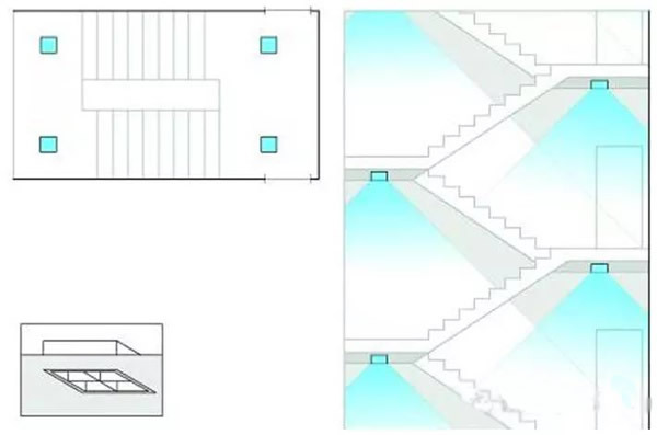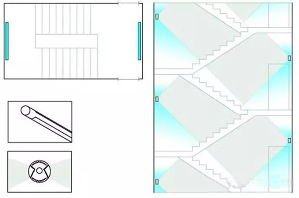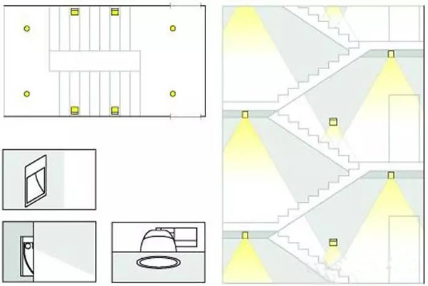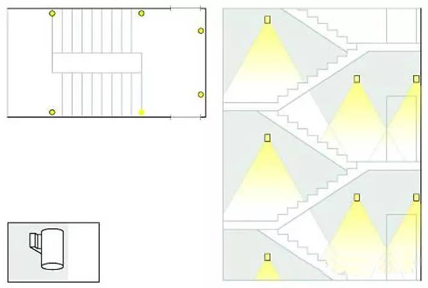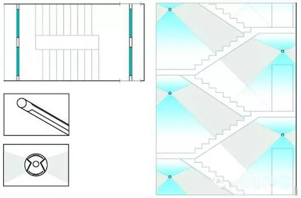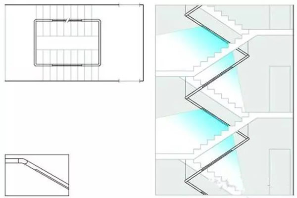 如果楼梯踏步与墙壁之间还有间隙,也可以安装灯带,洗亮墙壁,提供立面照明和空间间接照明。