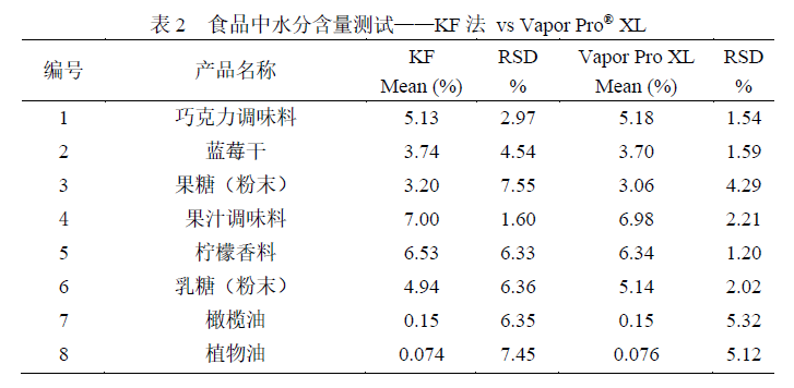 根据表2的测试数据,使用卡尔费休滴定法和Vapor Pro?XL这两种方法获得测试结果同样具有很好的相关性,并且在较大的水分含量范围内表现出极高的测量精度。两组测试结果之间不具有统计学意义上的显著差异。