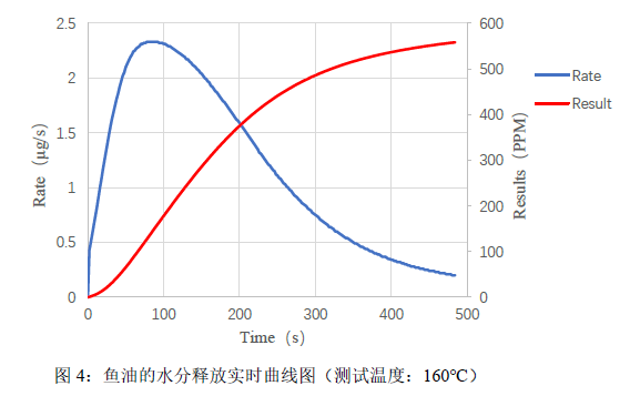 Vapor Pro XL水分仪还可以在测试时实时显示样品的水分释放情况,如图4所示为鱼油样品的实时水分测试数据。我们可以根据曲线图谱对测试方法进行进一步的优化,如调节结束条件和吹扫时间等,在不影响测量准确性的前提下尽量提高测试效率。