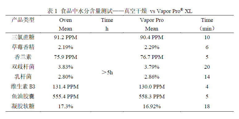 根据表1的测试数据,使用真空干燥法和Vapor Pro XL这两种方法获得测试结果具有很好的一致性,两组测试结果之间不具有统计学意义上的显著差异。但是,前者的测试时长通常需要超过5小时以上,而Vapor Pro XL的测试效率显著高于前者。Vapor Pro?XL仅需不到1g的样品量即可完成测试,获得重复性良好的测试数据。