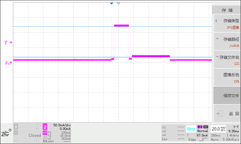 在测量模块正常工作模式的发射电流时,由于信号发射所需要的时间很短,整个电流是处于变化状态,我们称之为动态电流。万用表响应时间比较慢,很难捕捉到变化的电流,所以不能使用万用表测量,对于变化电流,需要使用示波器和电流探头进行测量,测量结果如下图。