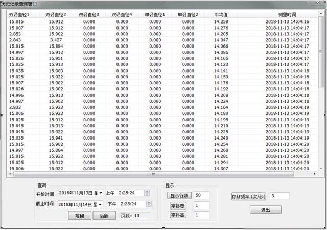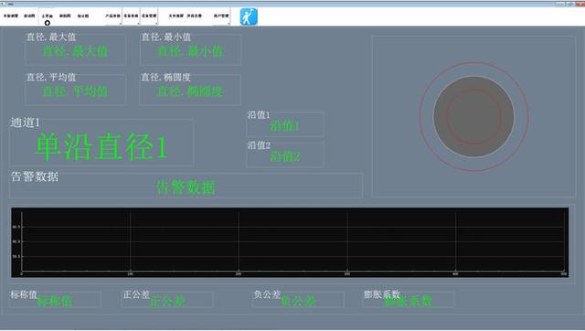 工控机现场显示:棒材外轮廓尺寸及截面图、公差带及超差数,尺寸波动趋势预报,缺陷分析曲线,圆钢截面的直径、椭圆度,各路测头的分项测量值。