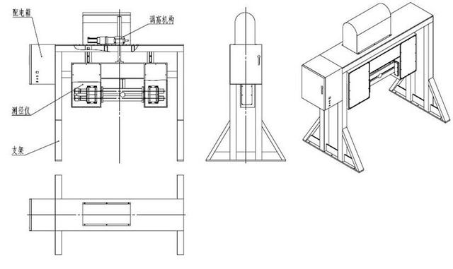 测径仪是单路测头水平设置的测径仪。测径仪安装在一个框架结构的支架上,通过导轨和调高丝杠与支架连接。当测量不同规格的棒材时,在切换规格时可自动调整测径仪的中心高度以适应棒材的中心高度。