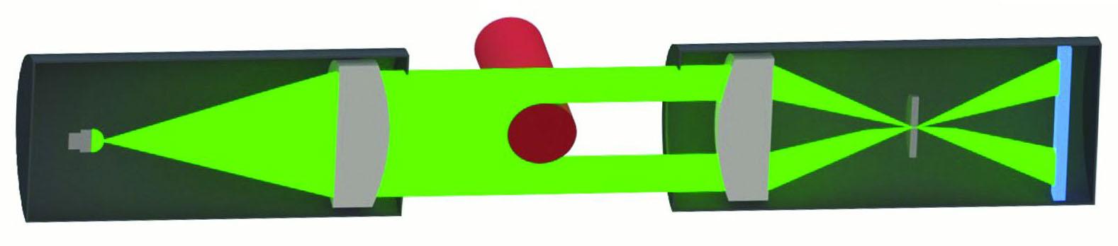 光电测径仪采用物方远心光路和成像法进行在线尺寸检测。检测的核心部件为光电测头,每组测头由发射镜头和接收镜头组成。发射镜头内点光源发出的光通过发射透镜形成平行光视场射向接收镜头。平行光再由接收透镜聚焦,通过位于焦点位置的光阑小孔后在接收单元上成像。当视场中通过被测物时,被测物遮挡的部位将在接收单元的芯片上呈现出边界清晰的阴影。通过光电转换和数字化处理,即可通过阴影的宽度计算出被测物的直径。