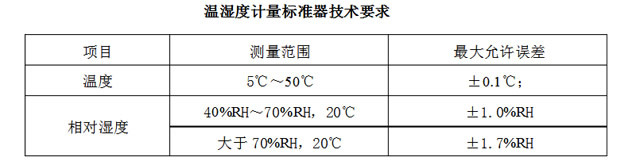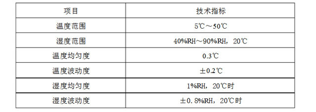 温湿度检定箱:温湿度检定箱必须具有自动调温功能,箱内工作室的有效容积不小于40L,且应配有开门和大面积透明观察窗。其技术指标均应符合下表要求:
