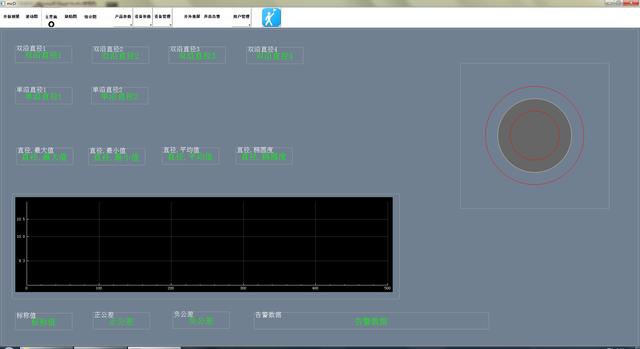 显示器软件界面显示:棒材外轮廓尺寸及截面图、公差带及超差数,尺寸波动趋势预报,缺陷分析曲线,圆钢截面的直径、平均直径、椭圆度,各路测头的分项测量值。