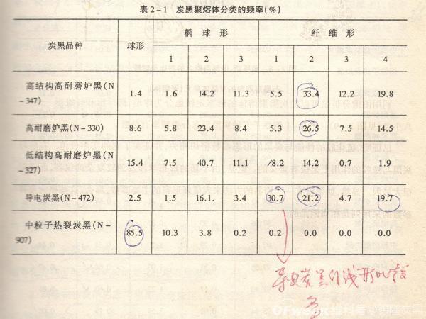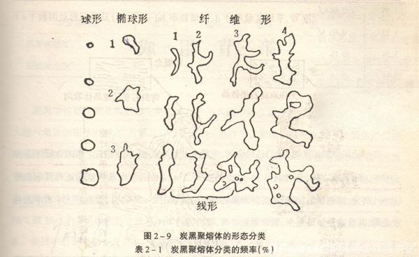 利用图像分析仪可以把炭黑聚熔体的形态定性地分为球形、椭球型和纤维形三大类,八小类(见图2-9)。表2-1例举了五种炭黑形态分类频率百分数。
