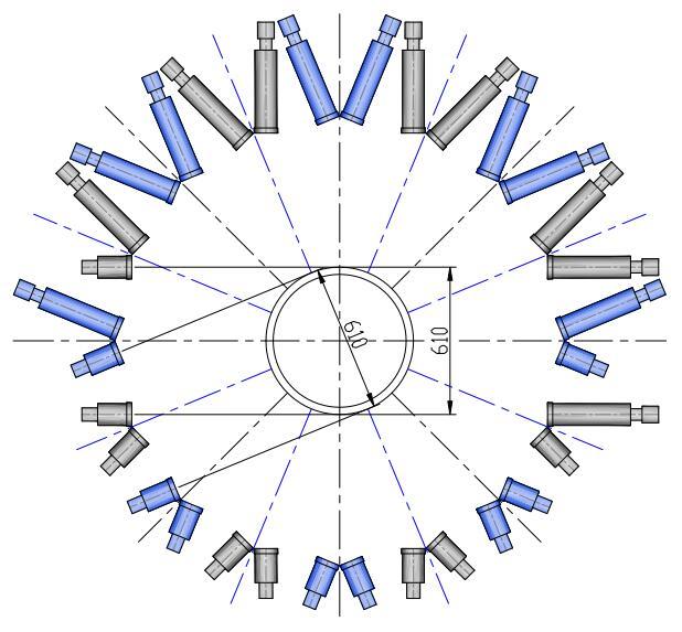 LPBJ610.8型测径仪用于φ610直缝焊管的在线检测,采用的是八向测量及双测头的测量方式进行测量,测量方法是每组测头都分别测量直缝钢管的边缘直径,加上中间固定尺寸,即可得到一个方向上的直缝钢管外径,将八组双测头均匀分布于直缝钢管周围,即可得到八轴向测量尺寸。