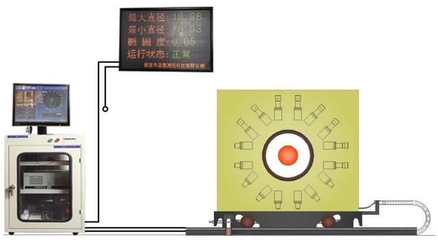 轧钢测径仪安装在钢管检测线上,对通过检测线的钢管在线进行几何尺寸检测。测径仪测量范围为575~645mm可对该范围内的钢管进行在线检测。测径仪与上位机间采用TCP/IP标准工业接口、光缆传输,检测信号画面送至主操作室的工控机上;现场LED显示屏与工控机间采用TCP/IP标准工业接口、光缆传输;操作室内LCD显示终端和现场LED显示屏同步显示。可实时反映钢管的尺寸变化。